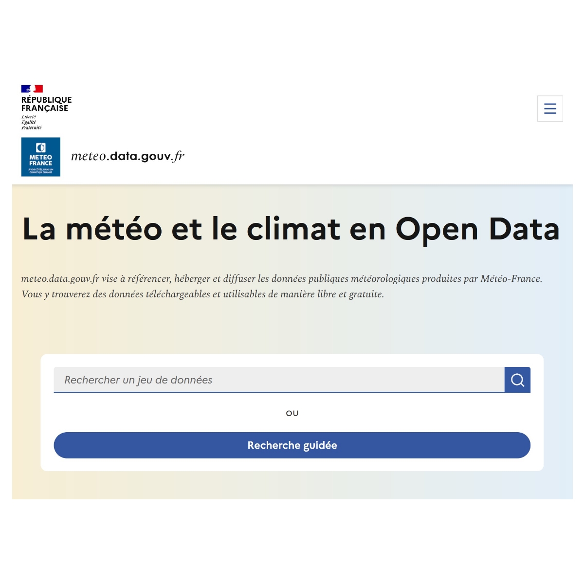 En page d'accueil du site meteo.data.gouv.fr, on trouve deux onglets qui vont permettre d'accéder aux données : "Données" et "Recherche guidée".