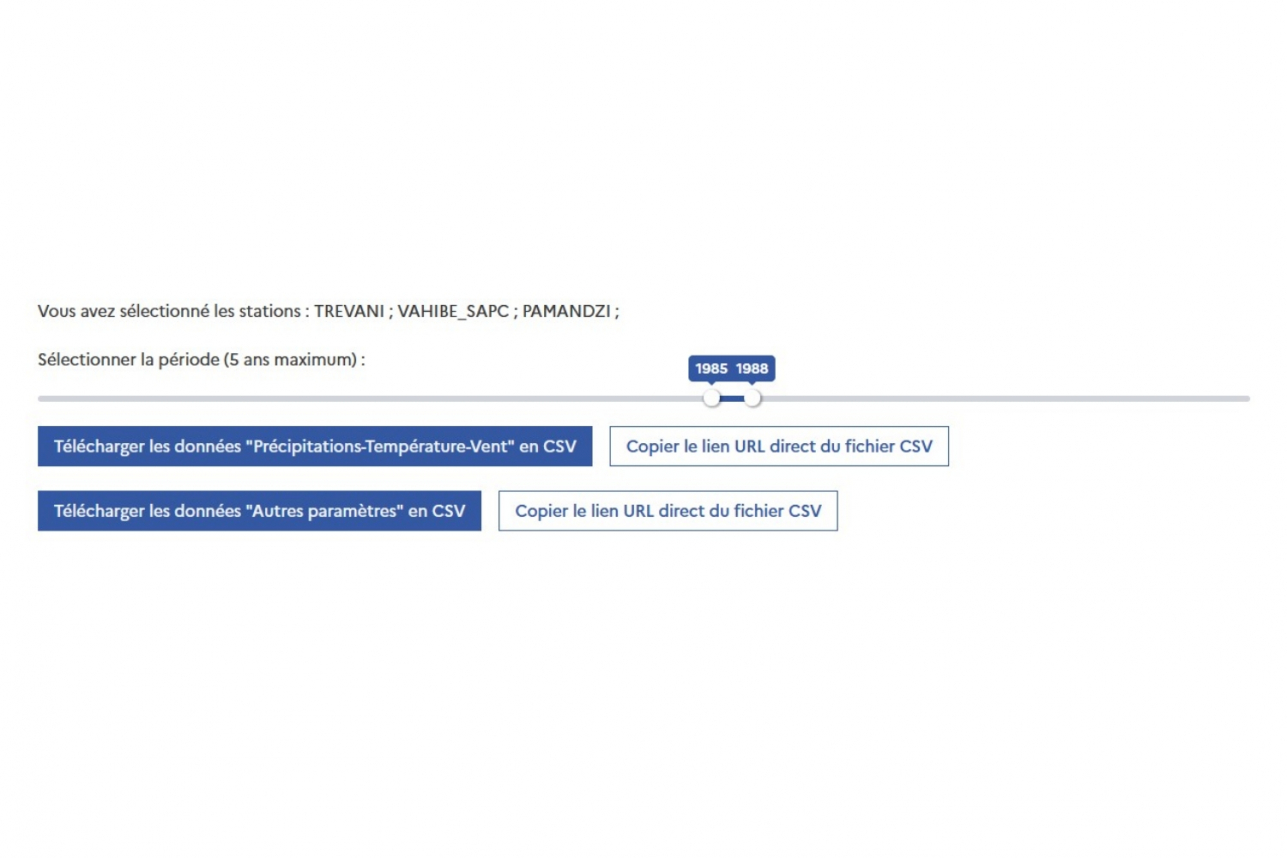 Il suffit ensuite de sélectionner la période d’extraction de données stations souhaitée et cliquer sur « Télécharger les données en csv » (image 3 ci-dessous). Certaines données sont réparties en plusieurs fichiers, par exemple « Vent » et « Autres paramètres ». Il est possible de télécharger les données pour 5 ans maximum, donc à renouveler autant de fois que nécessaire pour couvrir toute la période d'étude si elle dépasse les 5 ans. Attention, les fichiers peuvent être lourds et nécessiter du temps pour le téléchargement.
