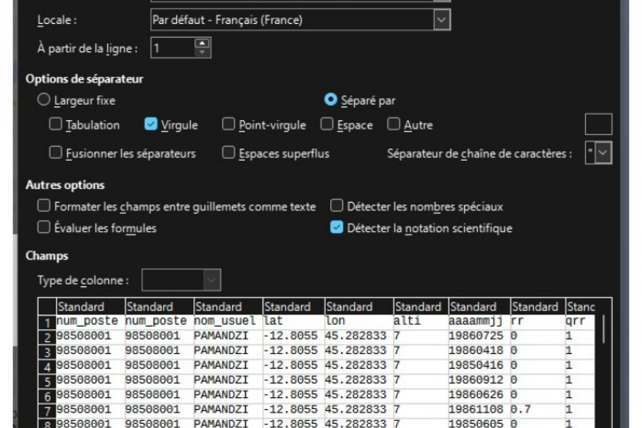 Dans chaque fichier tableur téléchargé, chaque ligne correspond à une des stations sélectionnées, et un pas de temps temporel. Dans notre exemple, avec un fichier de données climatologiques quotidiennes, une ligne correspondrait aux données de la station « Pamandzi », le 25 juillet 1986.