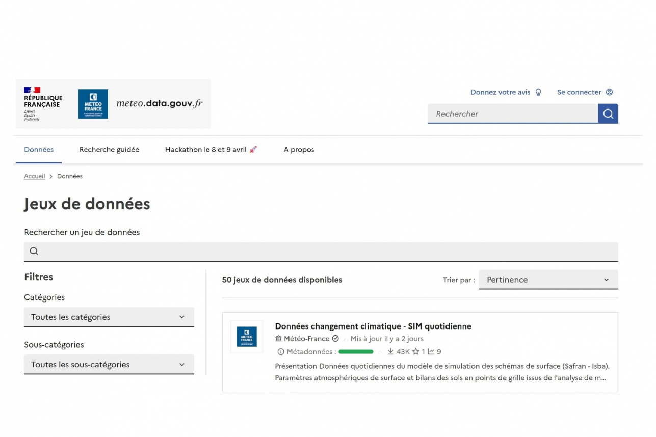 "Données" permet d'accéder à la liste de tous les jeux de données disponibles (image 1 ci-dessous) . Sur la gauche de l'interface, on trouve des filtres pour sélectionner plus facilement certaines catégories de données. Les besoins les plus fréquents des usagers concernent les données climatologiques des stations de Météo France.