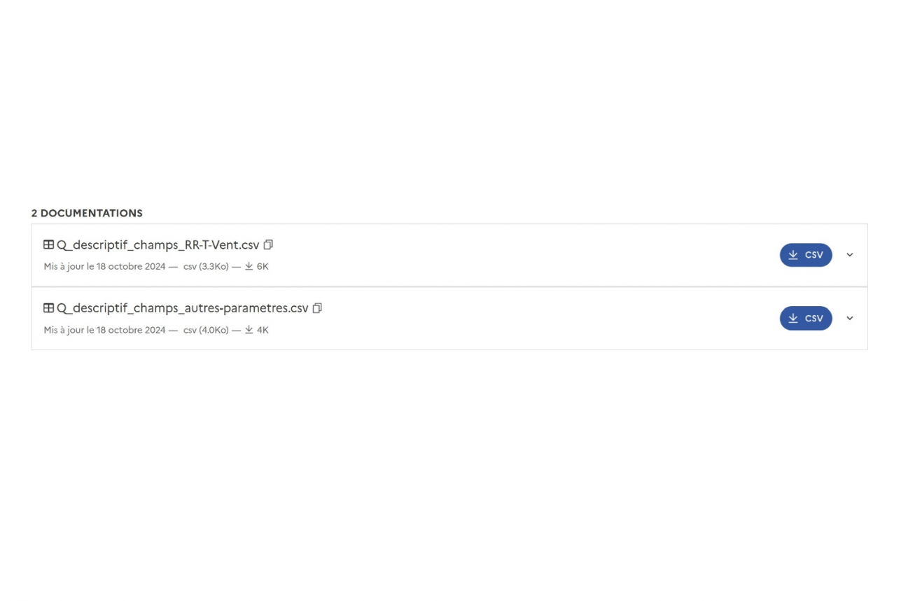 Le détail des paramètres va dépendre souvent du pas de temps de mesure choisi. Le descriptif complet des champs se trouve dans les pages des jeux de données correspondants, dans l'onglet "Données", comme expliqué en première partie de cet article (image 2)