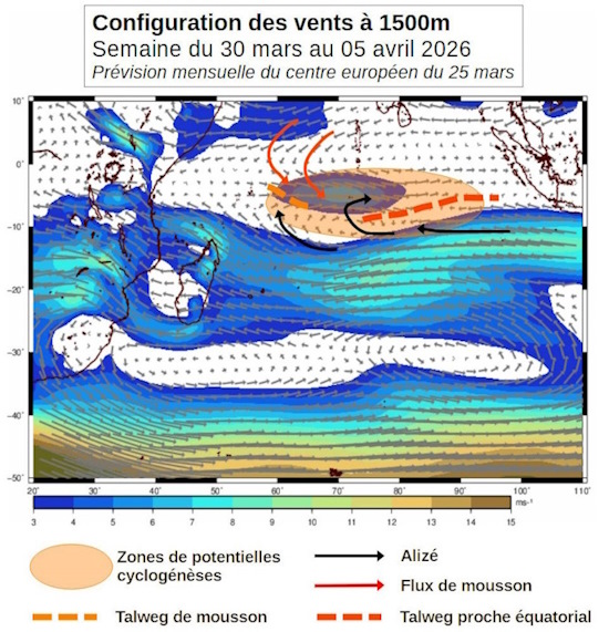 Depuis le cyclone tropical HORACIO qui a été suivi jusqu'en fin février, l'activité cyclonique est restée nulle durant ce mois de mars si on ne tient pas compte du système N°12 qui n'a pas dépassé le stade de dépression tropicale. Cette longue pause, qui a marqué la fin du cœur de saison humide, ne signe pas pour autant la fin de la saison cyclonique. En effet même si certains facteurs sont encore peu favorables, les conditions environnementales sur le sud-ouest de l'océan Indien devraient s'améliorer dans l'ensemble durant les deux prochaines semaines. Elles pourraient alors devenir plus propices à une nouvelle activité cyclonique en S2 et S3. Si des systèmes venaient à se former en S2 ou S3, leur existence pourrait alors se poursuivre ensuite en S4. Les potentiels systèmes se formant entre S2 et S4 se dirigeraient d'abord vers l'ouest et prendraient ensuite rapidement une composante vers le sud pour contourner l'anticyclone. L'enjeu éventuel sur les terres habitées se limiterait donc à l'archipel des Mascareignes. Par la suite, les conditions devraient recommencer à être peu à peu défavorables mais de nombreuses incertitudes nous empêchent à ce jour de prévoir plus clairement l'activité cyclonique à partir de S4.